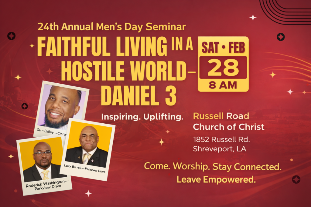 The Russell Road Church of Christ invites you to our 24th Annual Men’s Day Seminar, a powerful and uplifting gathering designed to encourage men to stand firm in faith in today’s challenging world. This year’s theme, “Faithful Living in a Hostile World” (Daniel 3), will challenge and inspire men to remain courageous, faithful, and grounded in God’s word, no matter the circumstances.